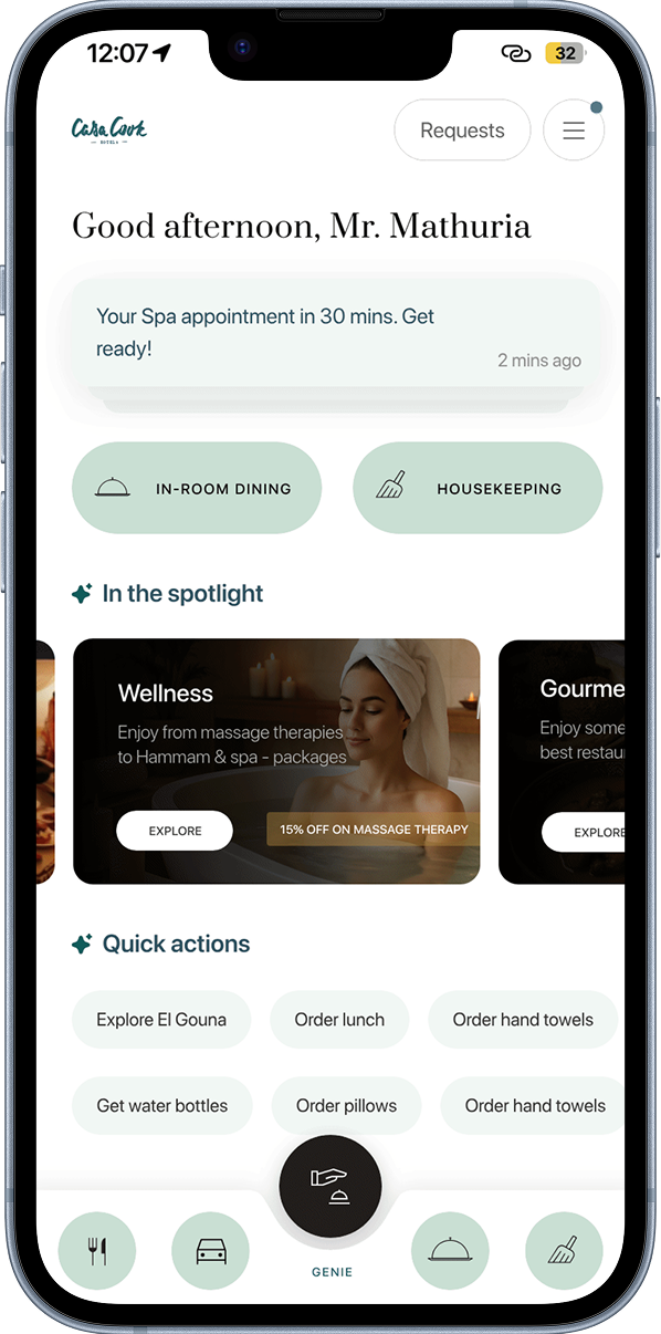 With Genie, guests can see everything they need in one place—without ever picking up the phone. From room changes and late checkouts to dining requests or upgrades, Genie makes it easy to act in just a tap.